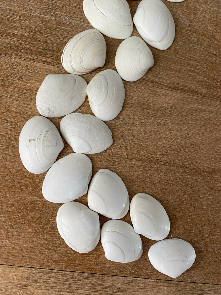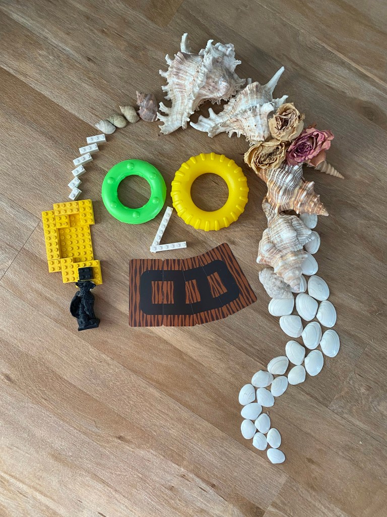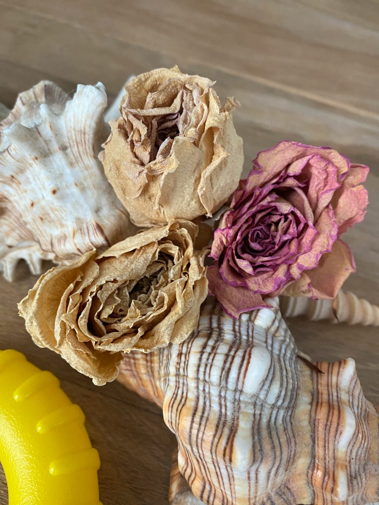 The shells are a mix of those beach-combed from local Cornish beaches and happy family holidays abroad. The dried roses are from my wedding, which we celebrated at home last year due to restrictions of the Coronavirus pandemic. The circular eyes are part of a child’s play set belonging to my young nephew, Alex.