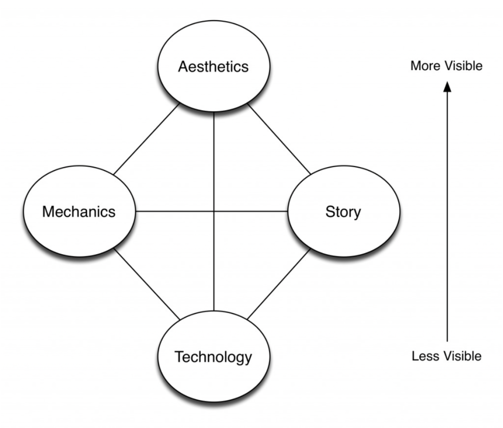 There are a range of tools that can be used to support ideation in game design and research including sketches and diagrams, paper prototyping, storyboards or user-driven prototypes. There are also some key game design frameworks that I have found useful in my ideation. The first is Jesse Schell’s Elemental Tetrad (2008) which splits game design into 4 key elements. Some of these elements are more visible to the player than others, but all must be considered and work together to support the design vision.