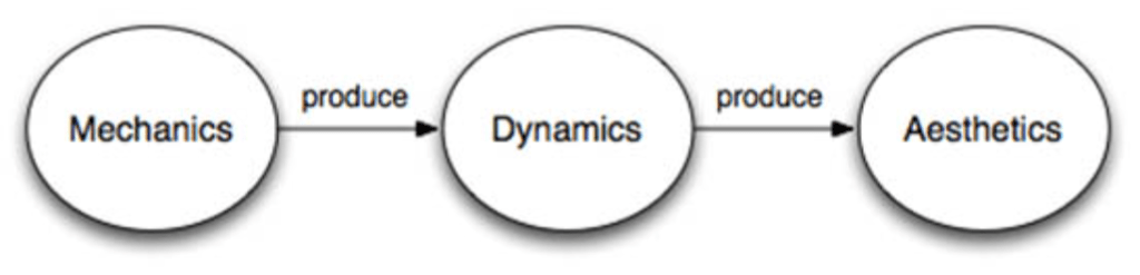 ‘Mechanics describes the particular components of the game, at the level of data representation and algorithms. Dynamics describes the run-time behaviour of the mechanics acting on player inputs and each others outputs over time. Aesthetics describes the desirable emotional responses evoked in the player, when they interact with the game system’
