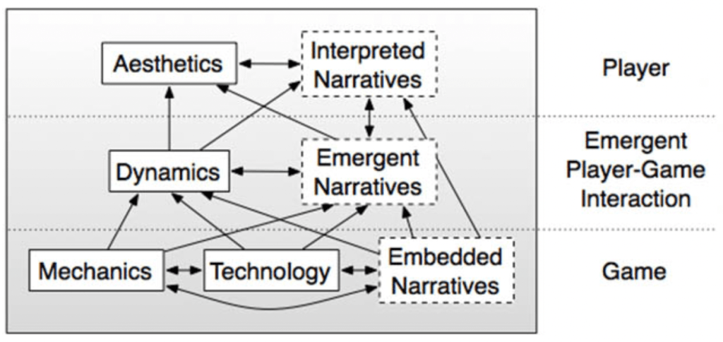 Ralph and Monu have further expanded on these frameworks to create MTDA+N, which includes a more nuanced breakdown of game narrative types which I have also found thought provoking. In particular, when considering what parts of a story the game itself will tell vs what will be told by player-game interaction and also the player themselves (2014).