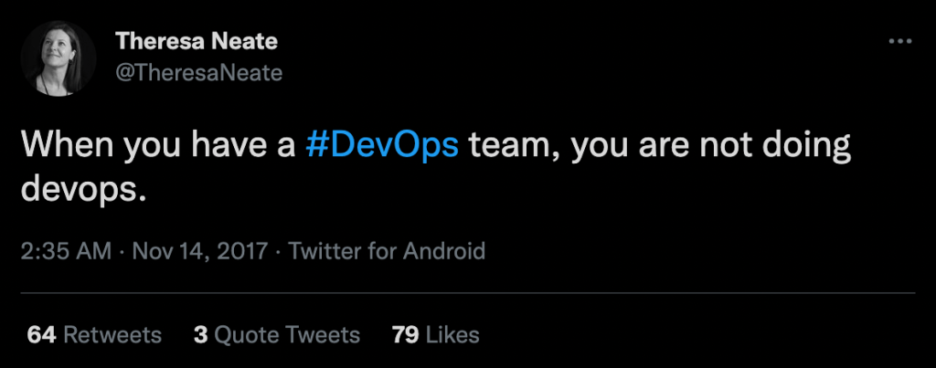 NEATE, Theresa. [@TheresaNeate] 2017 When you have a #DevOps team, you are not doing devops, November 14 [Twitter post]: Available at: https://twitter.com/TheresaNeate/status/930262953172942849 . [accessed 13th December 2021]